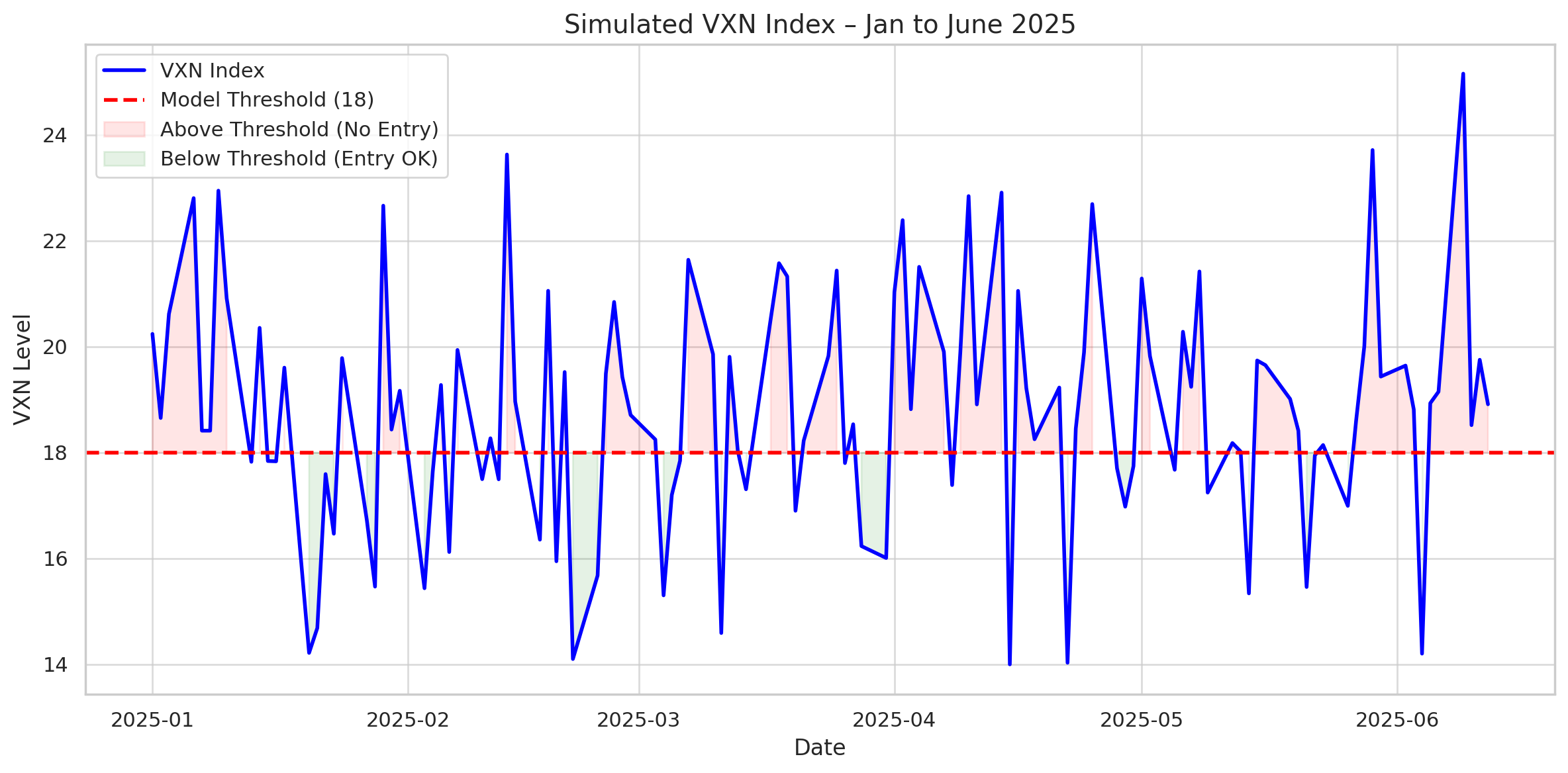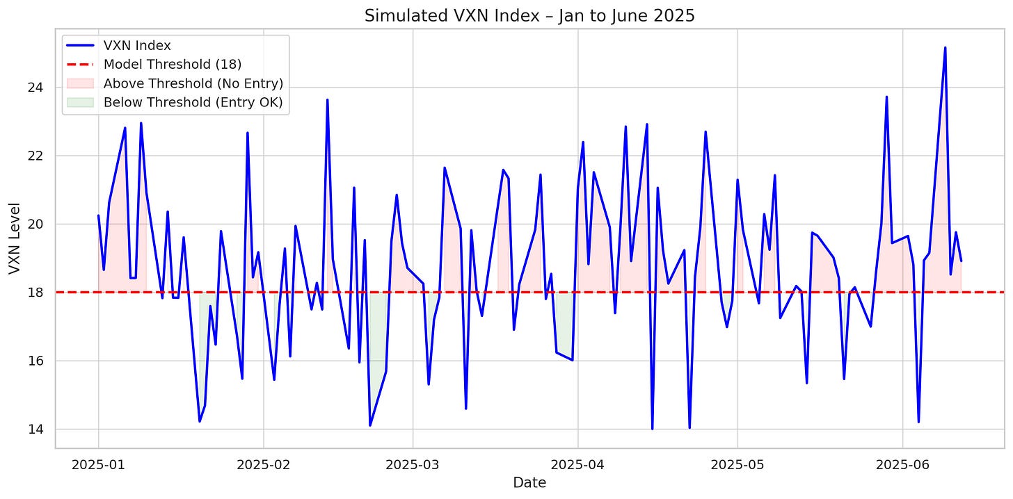 Our model uses the VXN — the Nasdaq-100 Volatility Index — as a proxy for market stress. When VXN is above 18, the model refuses to re-enter, no matter how promising the price action looks.